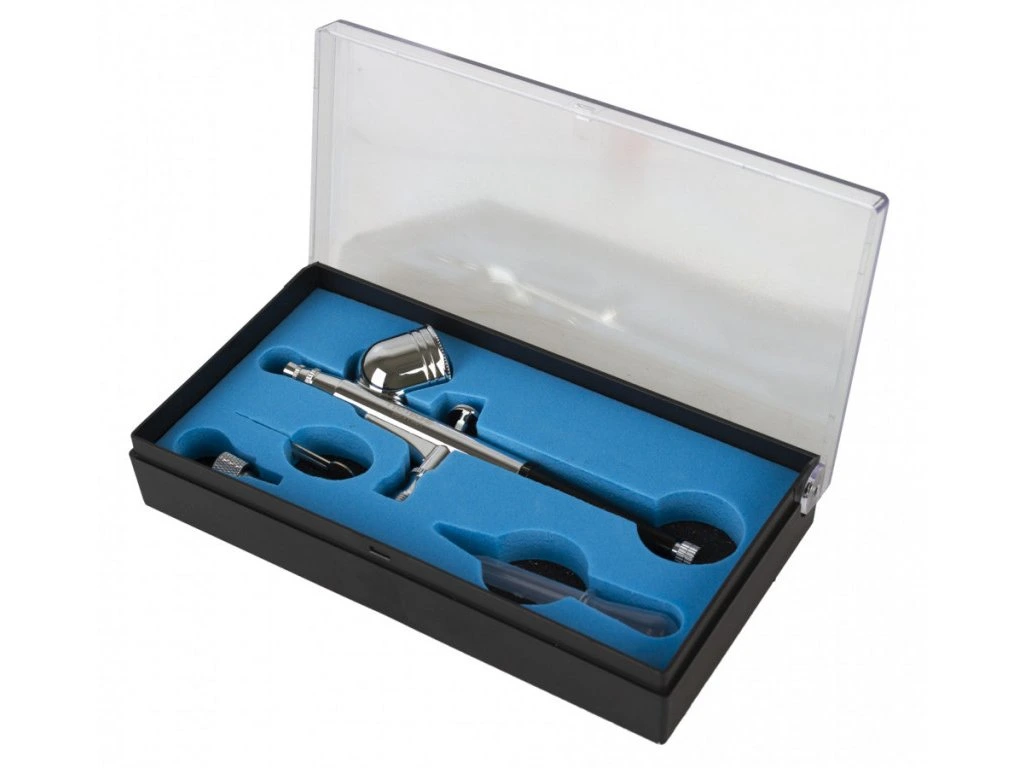 Stříkací airbrush pistole dvojčinná, se šroubovací tryskou 0,3 mm a šálkem na 7 ml laku, v plastové kazetě – Hoteche HTA831301
