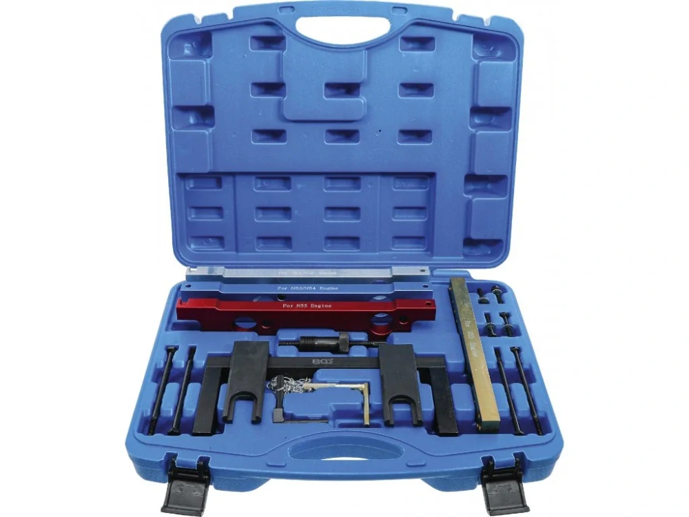 Aretační přípravky na rozvody atmosférických i přeplňovaných (turbo) 6válcových benzínových motorů BMW řad N51, N52, N53, N54 a N55, sada v plastovém kufru - BGS technic 70111