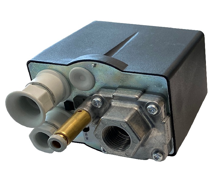 Tlakový spínač s nastavitelným vypínacím tlakem. Třípólový vypínač a odvzdušňovací ventil. Pro kompresory s elektromotory 4-5,5 kW. Připojení 1/2".