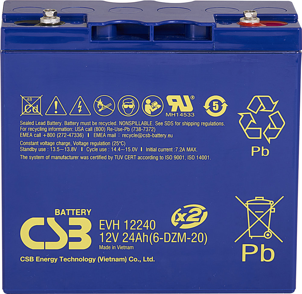 EVH12240 12V 24Ah – záložní, bezúdržbový, VRLA, uzavřený, akumulátor od CSB Battery. Technologie AGM. Určený pro cyklický provoz. Výhradní dovozce firma MICRONIX, spol. s r.o.