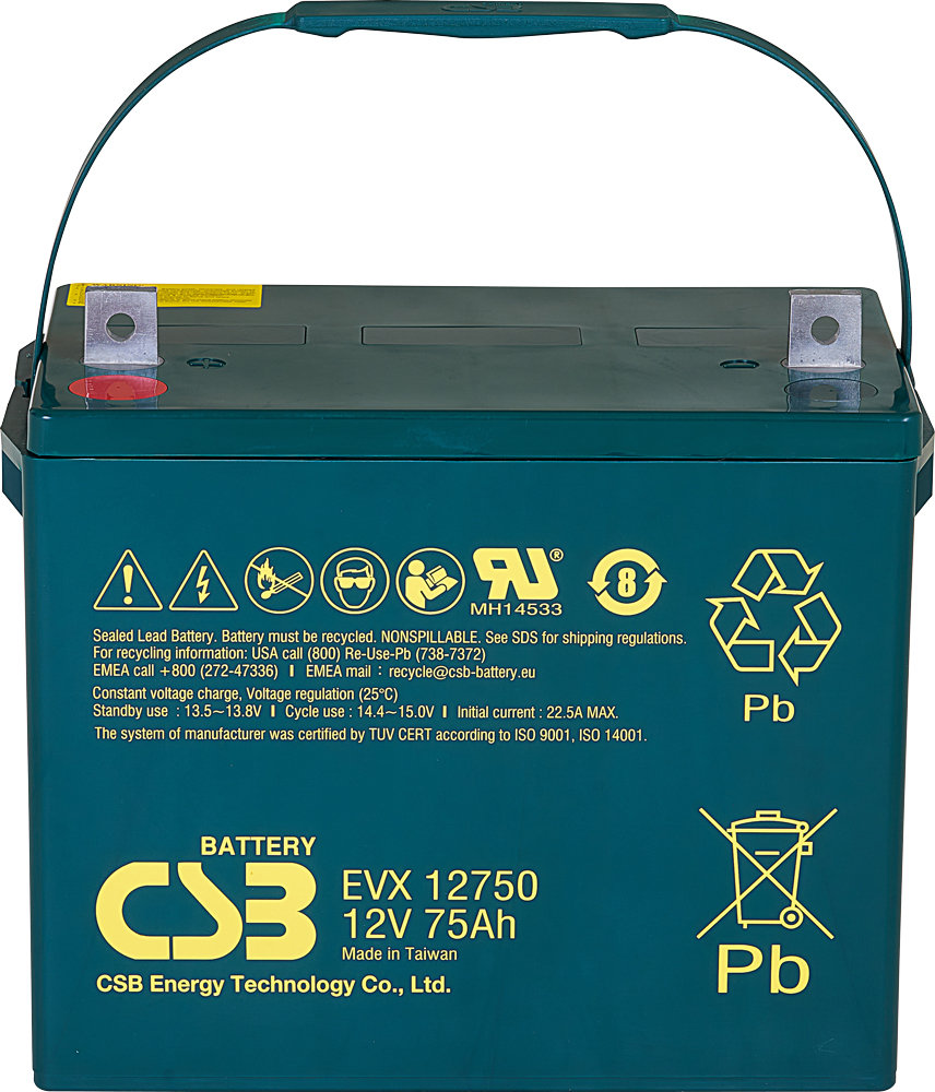 Baterie EVX12750 mohou být užívány pro více jak 400 cyklů vybití nebo až 8 let v režimu „Standby". Tak jako ostatní baterie od CSB, jsou i tyto akumulátory bezúdržbové, uzavřené a pracující v jakékoli poloze.