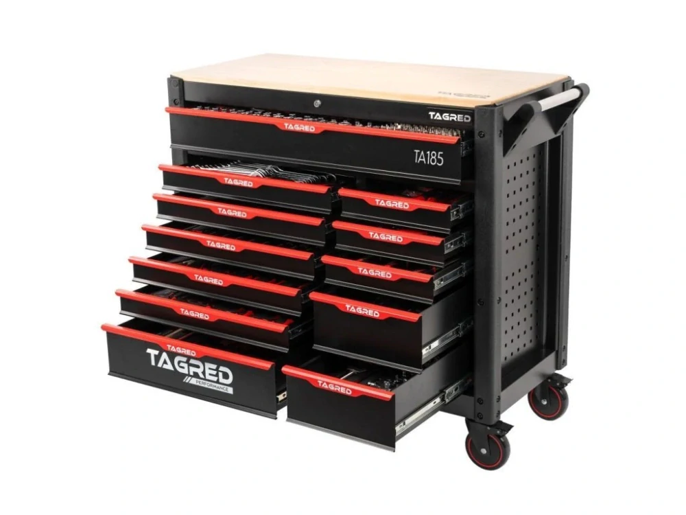 - TAGRED TA185 Dílenský vozík, vybavený, dřevěná deska, 12 zásuvek, sada nářadí 479 ks