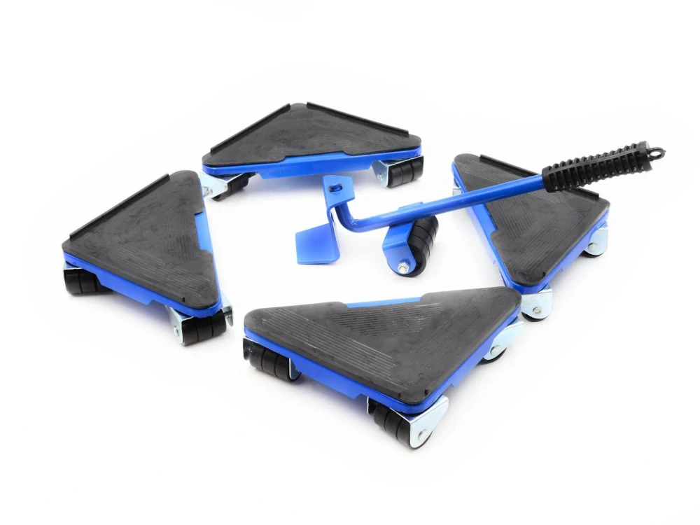 Praktická sada 4 ks trojúhelníkových plošin a zvedáku nábytku pro bezpečnou manipulaci a přesouvání skříní, komod a jiných.