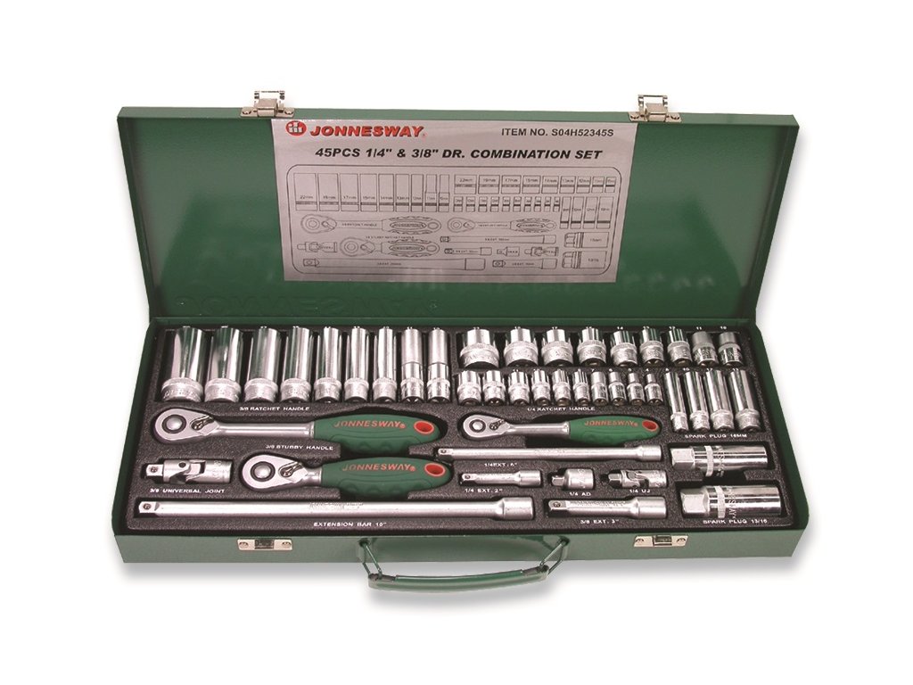 Gola sada s nářadím v metrických rozměrech, vodicí 4-hrany 1/4“ a 3/8“, 45 dílů v plechovém kufříku – JONNESWAY S04H52345S