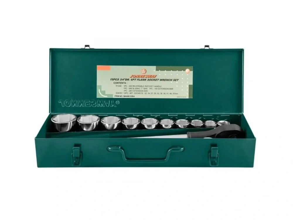 Gola sada metrických rozměrů, vodicí čtyřhran 3/4“, velikost hlavic 22-50 mm, 15 dílů v bytelném plechovém kufru – JONNESWAY S04H6315SA
