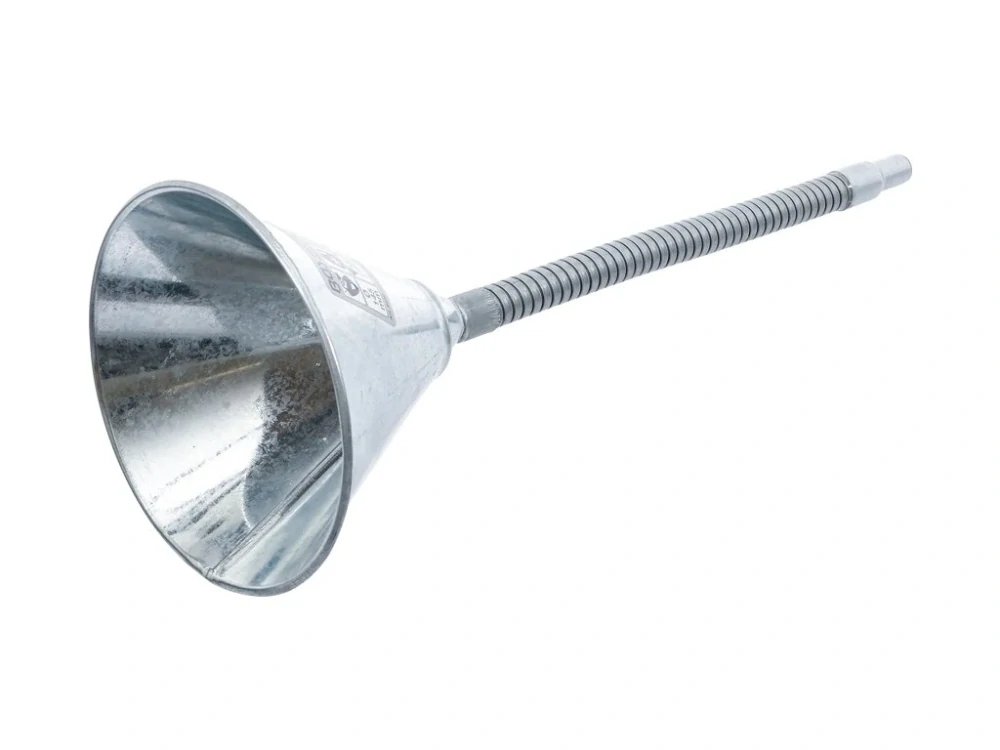 Trychtýř - nálevka s průměrem 14.5 cm, 30cm ohebnou trubkou „husím krkem“ a sítkem, kovový - BGS technic 8030