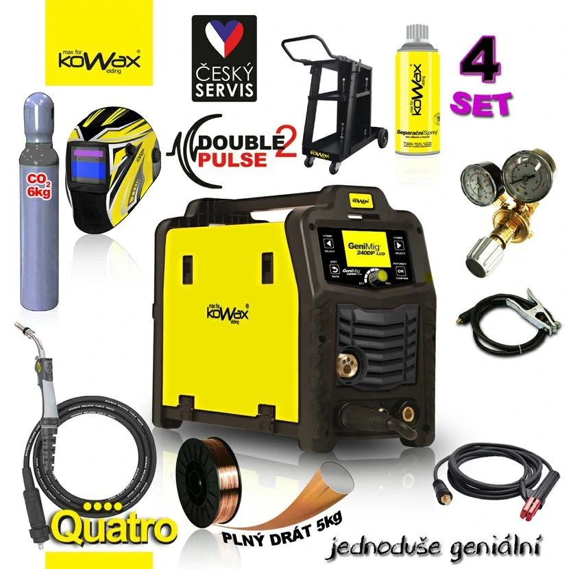 KOWAX GeniMig 240DP LCD MIG/MAG/LiftTIG/MMA SET 4Q + SAMOSTMÍVACÍ KUKLA + LAHEV CO2 + VENTIL + VOZÍK + DRÁT + SPREJ
