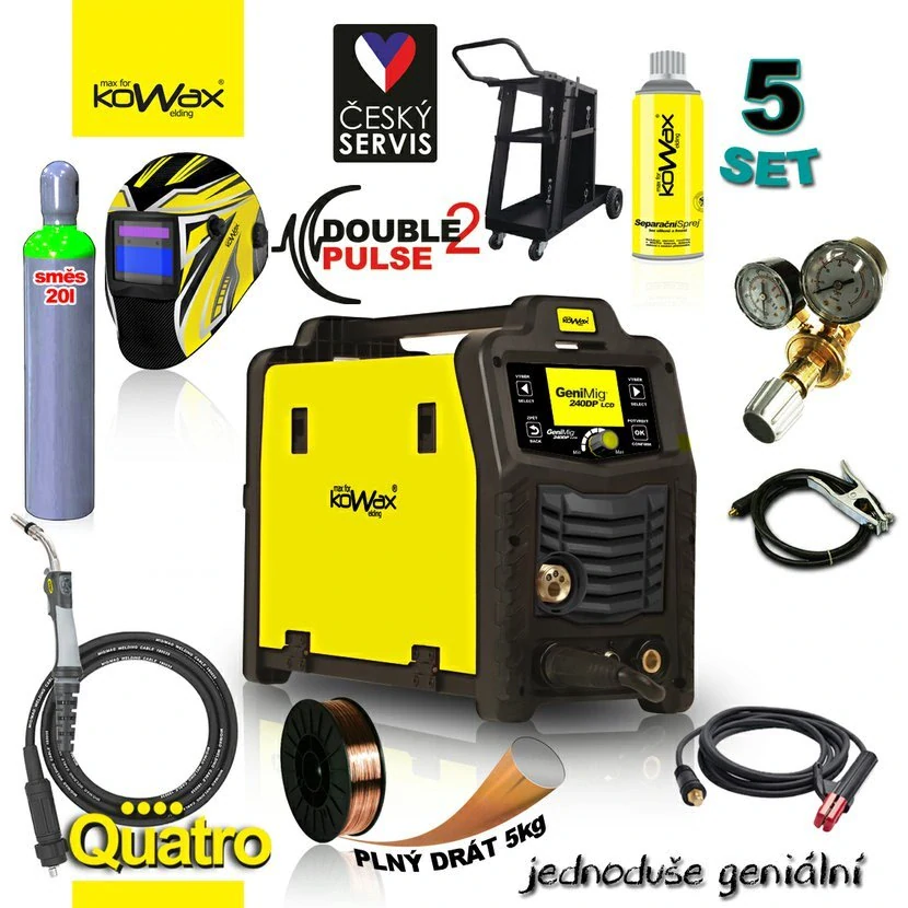 - KOWAX GeniMig 240DP LCD MIG/MAG/LiftTIG/MMA SET 5Q + SAMOSTMÍVACÍ KUKLA + LAHEV AR/CO2 20L + VENTIL + VOZÍK + DRÁT + HOŘÁK QUATRO