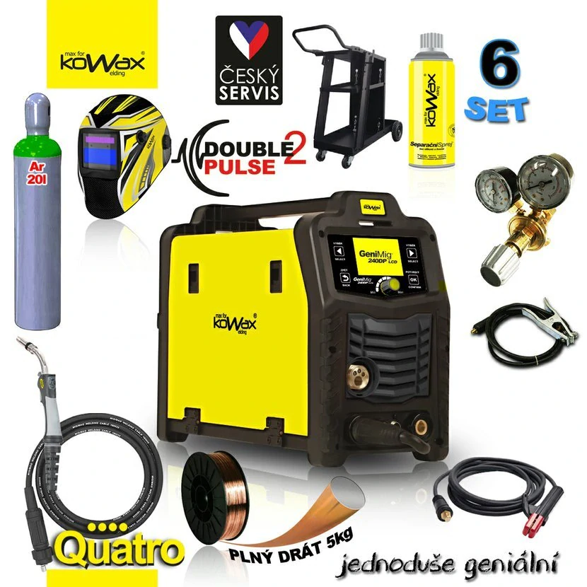 - KOWAX GeniMig 240DP LCD MIG/MAG/LiftTIG/MMA SET 6Q + SAMOSTMÍVACÍ KUKLA + LAHEV AR 20L + VENTIL + VOZÍK + DRÁT + HOŘÁK QUATRO
