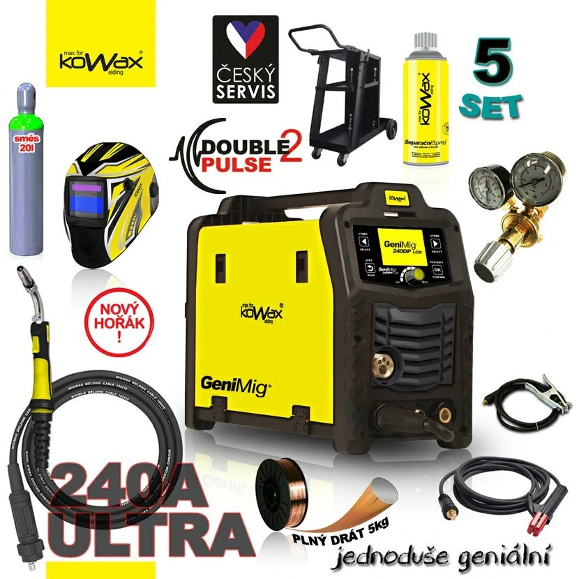 - KOWAX GeniMig 240DP LCD Svařovací invertor MIG/MAG/LiftTIG/MMA SET 5 + SAMOSTMÍVACÍ KUKLA + LAHEV AR/CO2 20L + VENTIL + VOZÍK + DRÁT + SPREJ