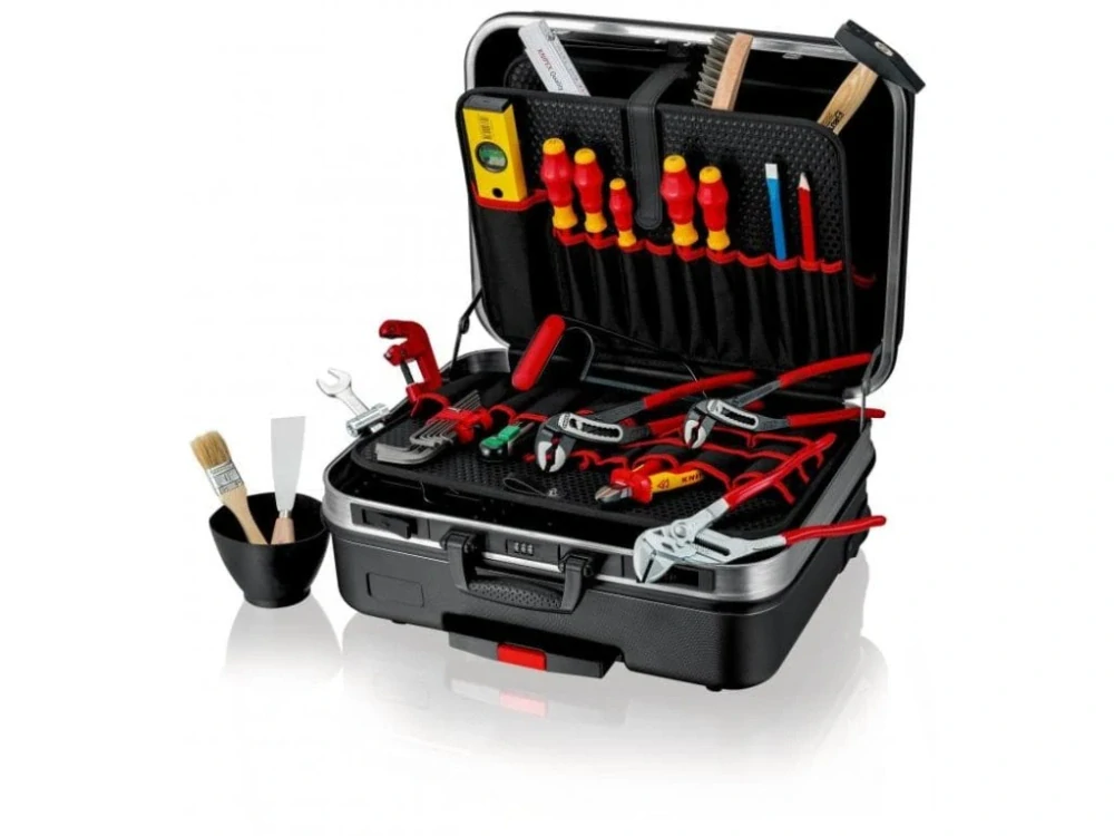Mimořádně prakticky poskládaná a velmi rozsáhlá souprava nářadí pro komplexní opravy rozvodů vody. Obsahuje vše od A do Z – od vysekání otvoru do zdi přes opravy potrubí až po zapravení díry po skončení práce. Set je vybaven 4 nástroji KNIPEX a celkem 31 značkovými nástroji, částečně testovanými asociací VDE podle DIN EN 60900.