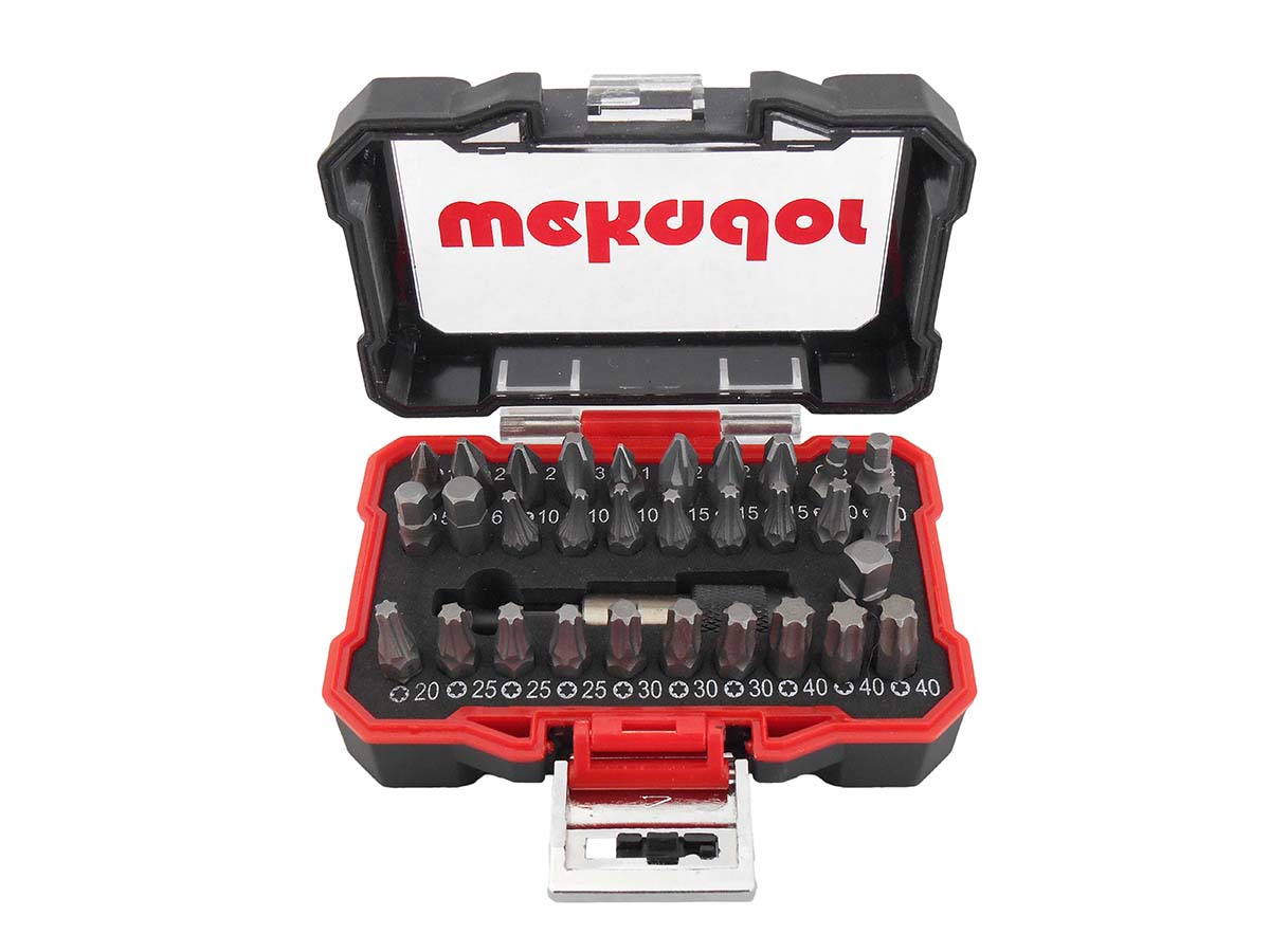 Sada obsahuje: 1x držák,1x nástavec, 1x PH1, 2x PH2,1x PH3,1x PZ1,2x PZ2, 1x PZ3,1x SW3,1x SW4,2x SW6, 3x T10, 3x T15,3x T20,3x T25,3x T30,3x T40