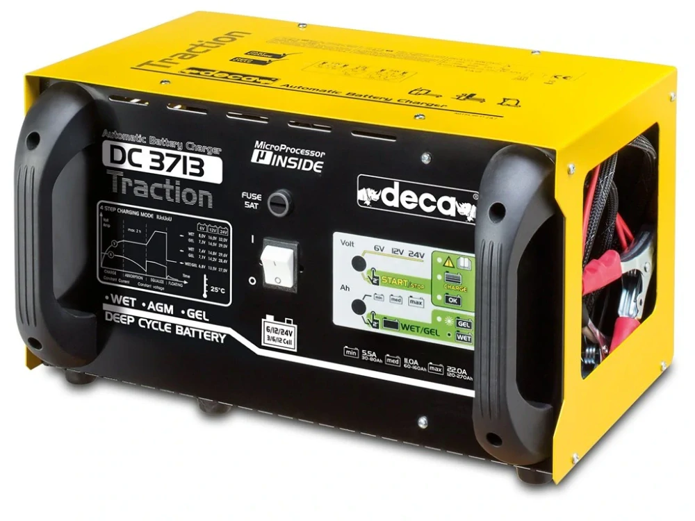DC 3713 - Automatická mikroprocesorem řízená nabíječka 6V/12V/24V-22A. Výrobce firma DECA. Nabíječka je speciálně navržena pro nabíjení trakčních/cyklických olověných kyselinových, bezúdržbových (MF), AGM a gelových akumulátorů o kapacitě 30Ah - 270Ah