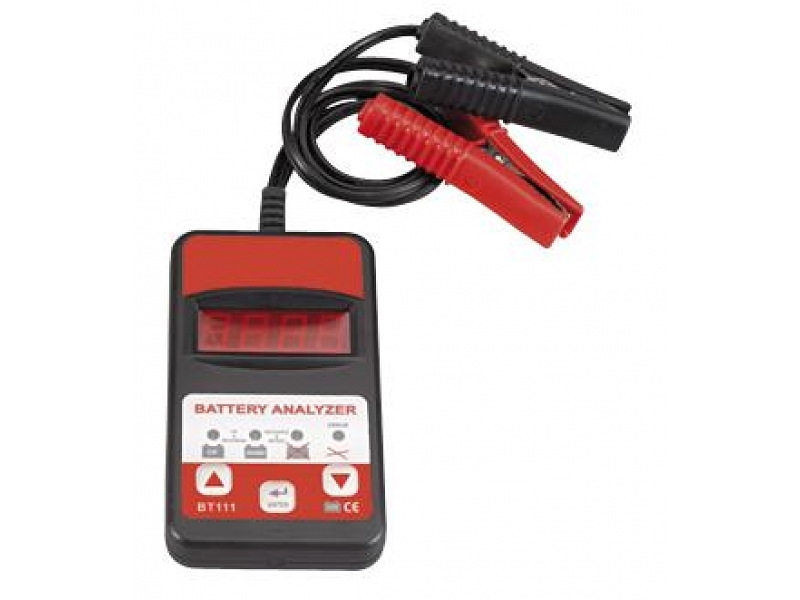 Velmi jednoduchý a celkem přesný tester 12V autobaterií. Vhodný pro klasické kyselinové, gelové a AGM baterie. Po připojení baterie tester na displeji ukáže okamžité napětí baterie. Zadáte typ baterie a normu, ve které chcete měřit (EN,DIN, atd.) a na displeji nastavíte hodnotu startovacího proudu měřené baterie. Poté tester ukáže aktuální startovací proud baterie. Diody se symboly baterie ukáží v jakém stavu baterie je: zda-li je nabitá, je nutné ji nabít či nahradit novou. Měří baterie od napětí 7V. Nepotřebuje žádný zdroj - potřebné napětí si bere z měřené baterie.