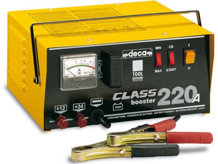 DECA Class Booster 220A – Přenosná nabíječka olověných akumulátorů 12/24V s funkcí rychlého startu. Startovací zdroj je schopen nastartovat automobil nebo malou dodávku. Nabíječka má dva nabíjecí režimy s průměrným nabíjecím proudem 13A.