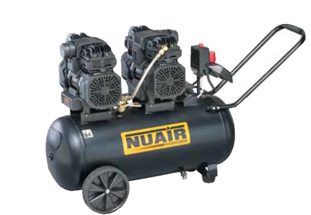 Model Nuair SILTEK TB 50 D se dvěma ultra tichými agregáty. Vhodný pro intenzivnější použití a větší zásobu stlačeného vzduchu, pro zajištění dlouhé provozní kontinuity. Konstrukční provedení madla a podvozku zajišťuje pohodlnou manipulaci a stabilitu. Tlakový spínač umožňuje práci v automatickém pracovním režimu.