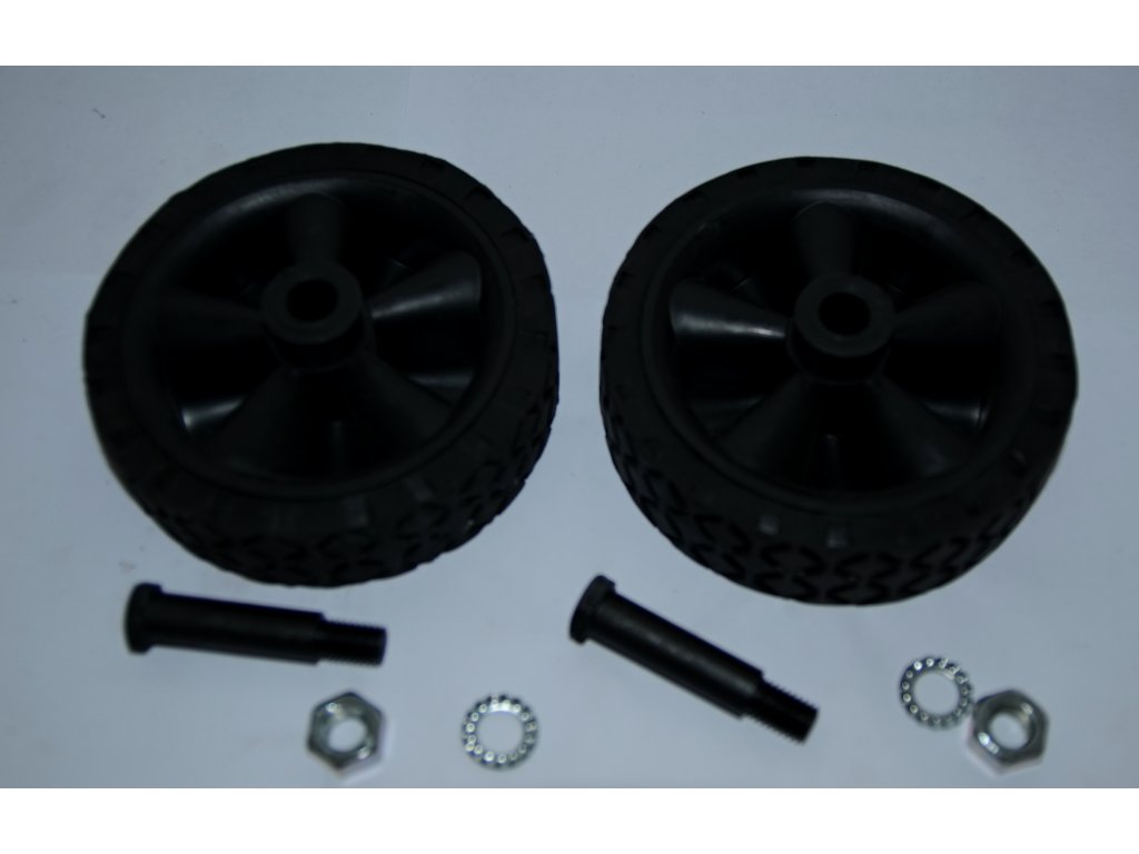 Obsahuje: dvě kola (plast/gumová obruč), čepy, matky, podložky
