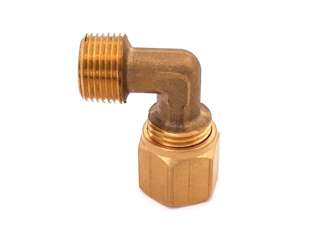 Mosaz, koleno, závit 3/8" oboustranný. Převlečná matice. Samosvorný kónus.