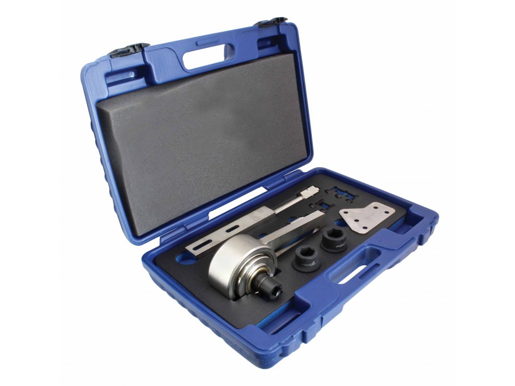 Speciální nástroj pro nastavení řemenice na „klice“ do správné montážní polohy, dotahování šroubů ve správném pořadí a pro jejich správné dotažení (řemenice pak není povolená ani přetažená).