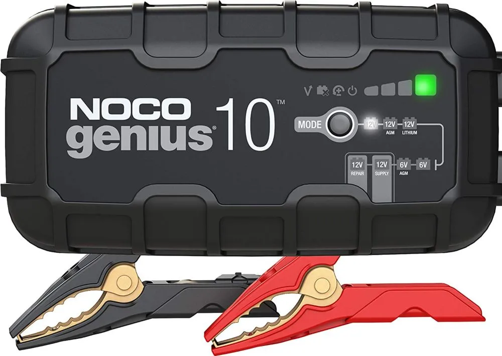 Nabíječka Genius 10 je určená pro servisy i pro běžného uživatele, který si potrpí na prvotřídní kvalitu a pohodlí při nabíjení. Noco Genius 10 kromě nabíjení také udržuje akumulátor v nabitém stavu. Výhodou je možnost trvalého připojení k nabíjenému akumulátoru. Nabíječka disponuje pamětí. Při výpadku napájení si pamatuje režim nabíjení a po obnovení napájení v něm pokračuje. Samozřejmostí je automatická teplotní kompenzace a plné nabití i při kolísání AC napájení. Genius 10 nabíjí s použitím desulfatačního režimu i hluboce vybité akumulátory s napětím od 1V, avšak s použitím režimu Force dokáže nabíjet akumulátory vybité i na 0V. Nabíječka má i režim zdroje, který nejvíc oceníte při výměně akumulátoru - počas výměny bude napájet elektroniku vozidla.