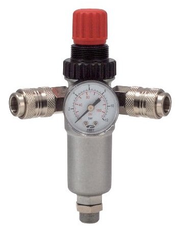 Regulátor tlaku s kovovým tělem včetně 2 ks výstupních univerzálních rychlospojek a manometru.