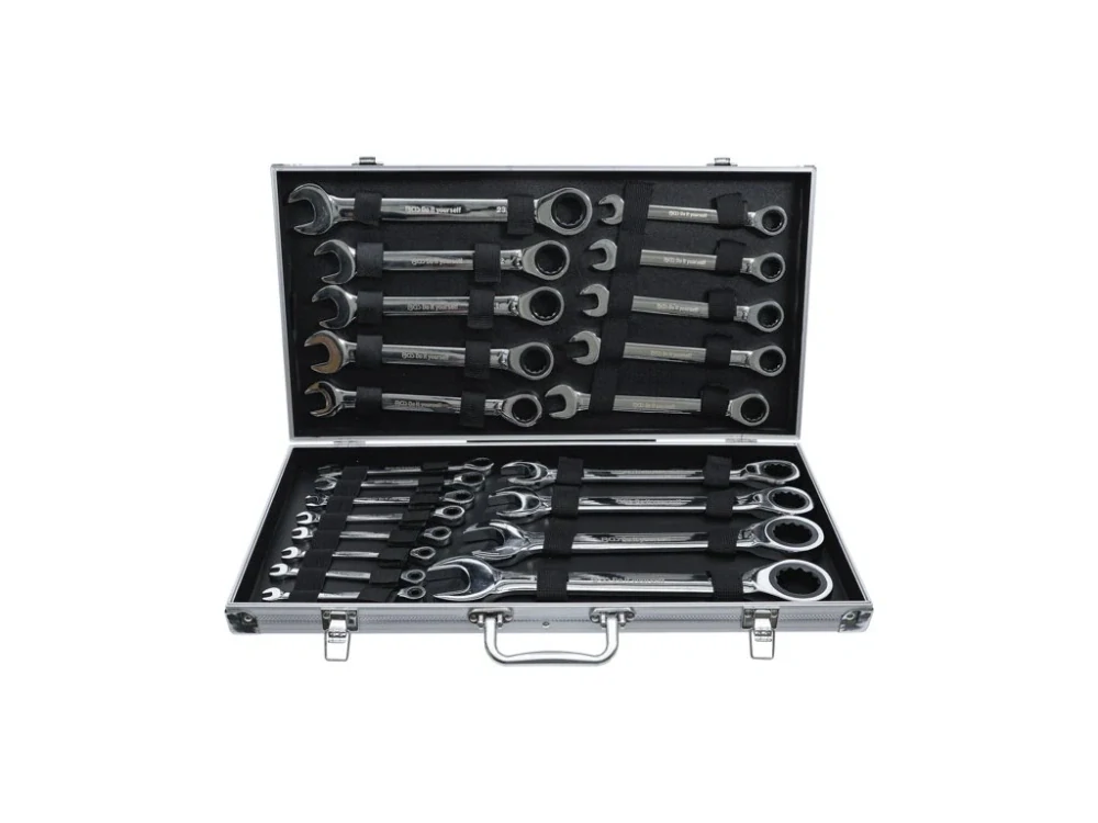 Sada oboustranných očkoplochých klíčů s ráčnou, rozměry 6 až 32 mm, 22 dílů v hliníkovém iufříku - BGS Do it yourself 30009