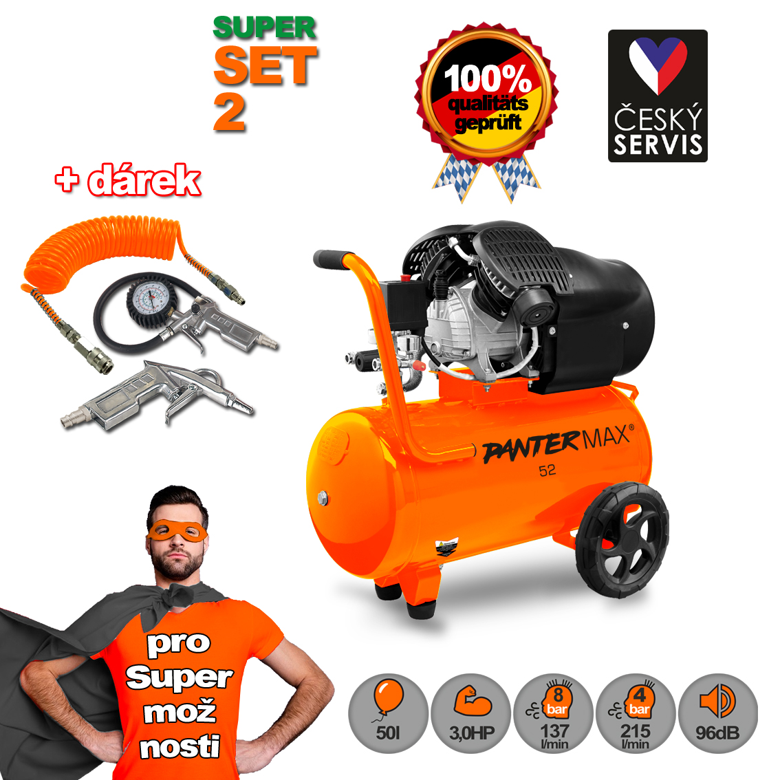 - PANTERMAX®AirFlow® 52 SET2 dvouválcový olejový kompresor + 3-dílná pneu sada