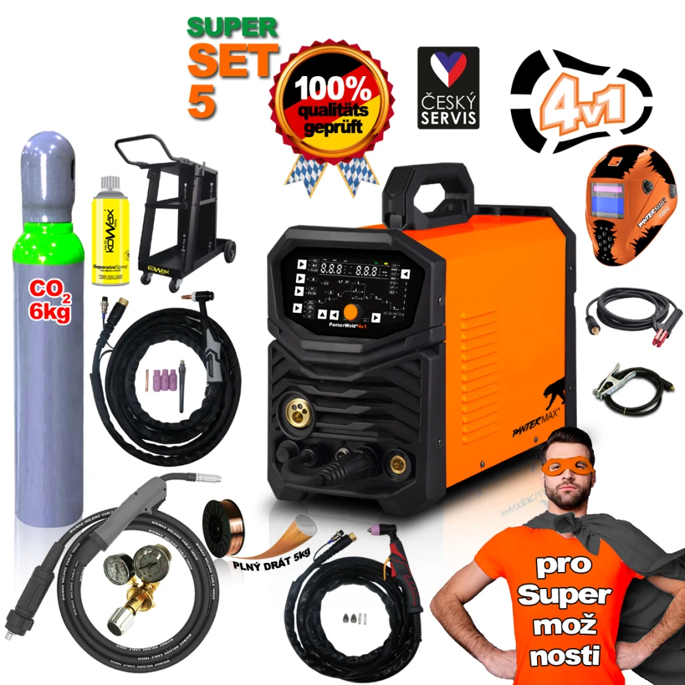 - PANTERMAX PanterWeld®4v1 200 MULTIFUNKČNÍ invertorová svářečka MIG/TIG/MMA/PLAZMA SET5 + KUKLA+ LAHEV CO2 + VENTIL + VOZÍK + DRÁT