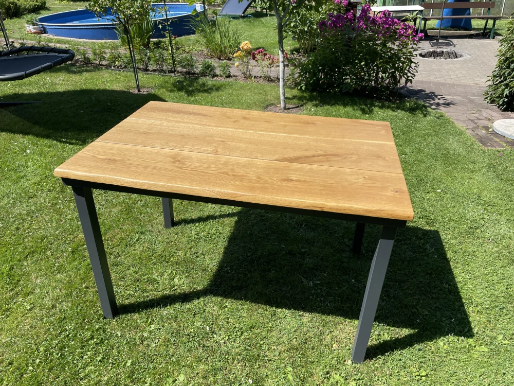 Řemeslně vyrobený bytelný zahradní stůl. Celá konstrukce, včetně nohou je ocelová, deska stolu je z dubového masívu tloušťky 2,7cm. Je opatřena kvalitním venkovním nátěrem určeném na zahradní nábytek.