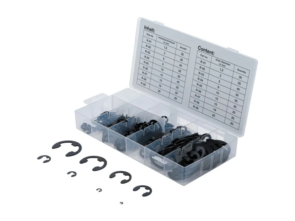 - BGS 8039 Pojistné kroužky třmenové („E-kroužek“), velikosti 1,5 až 22 mm, sada 300 ks