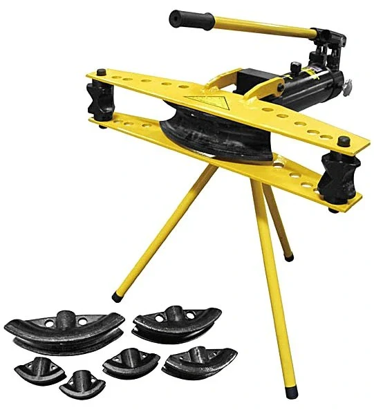Přenosná hydraulická ohýbačka trubek se stojanem se používá pro ohýbání železných trubek, nerezových trubek, trubek z barevných kovů apod. Skládá se z hydraulické pracovní jednotky/válce, ovládací hydraulické pumpy s pákou, držáku rolen dvou rolen, sady tvarových opěrek a třínožičkového stojanu. Vyznačuje se tuhou konstrukcí a velkou ohýbací silou 9 t. Charakterizuje ji i snadná a rychlá vyměnitelnost tvarových opěrek pro různé průměry trubek. Ohýbání trubek se provádí bez velké fyzické námahy. Kvalitní hydraulika a robustní konstrukční provedení zajišťují vysokou provozní spolehlivost a životnost bez nutnosti náročnější údržby.
