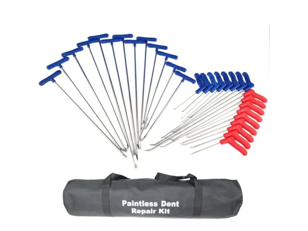 Sada speciálních přípravků na opravy důlků a promáčklin karosérií jejich vytlačením technologií PDR obsahuje 31 různě tvarovaných a různě dlouhých vyrovnávacích háků.