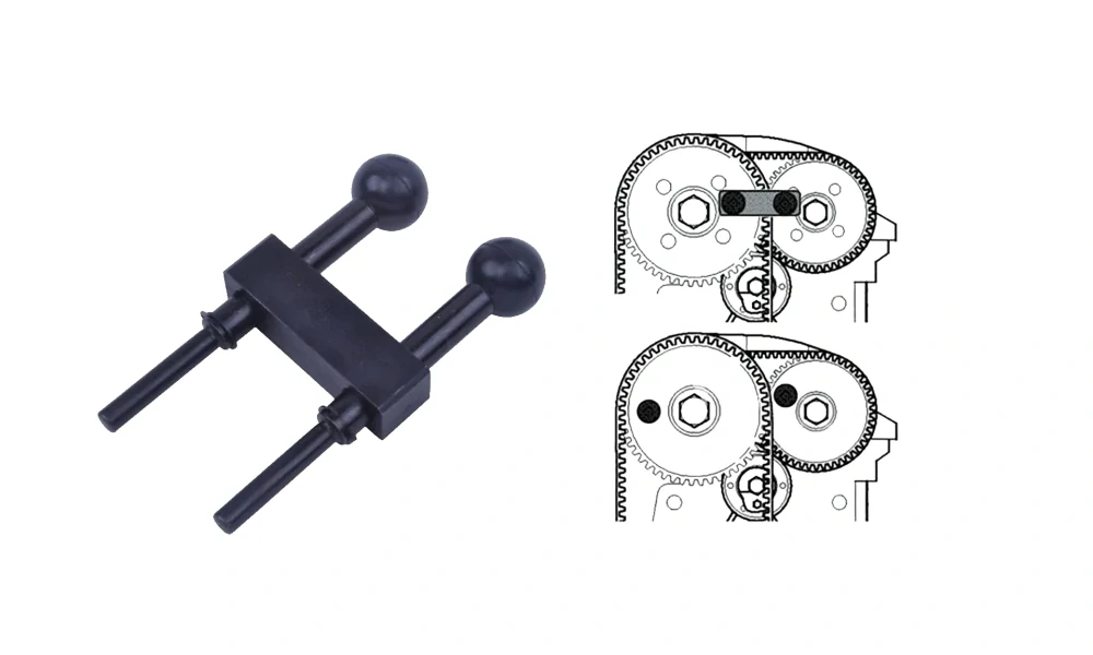 Přípravek lze použít jako originální nářadí OEM T10016 (aretační čepy se spojovacím blokem), nebo T10074 (samostatné aretační čepy).
