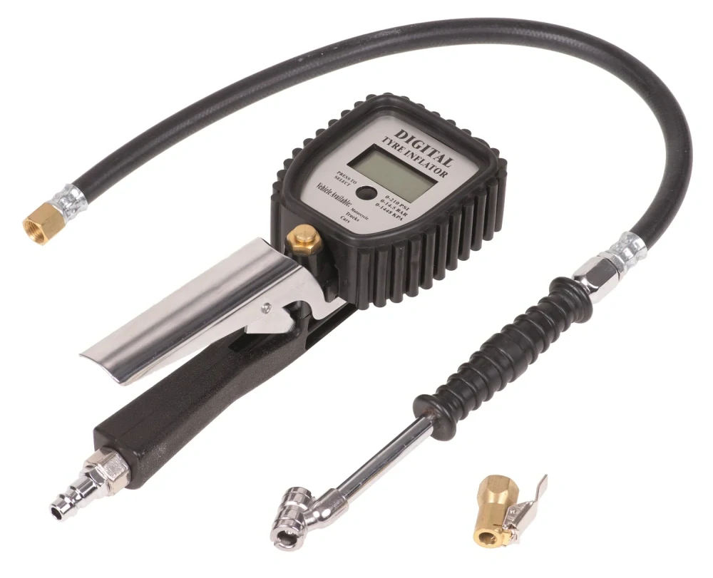 Univerzální pomůcka pro zkontrolování tlaku v kolech a jejich nafoukání na předepsanou míru. Orientace při práci je usnadněna dobře čitelným digitálním displejem s podsvícením a gumovou ochranou proti jeho rozbití, vzduch se pouští velkou pákou umístěnou hned u rukojeti.