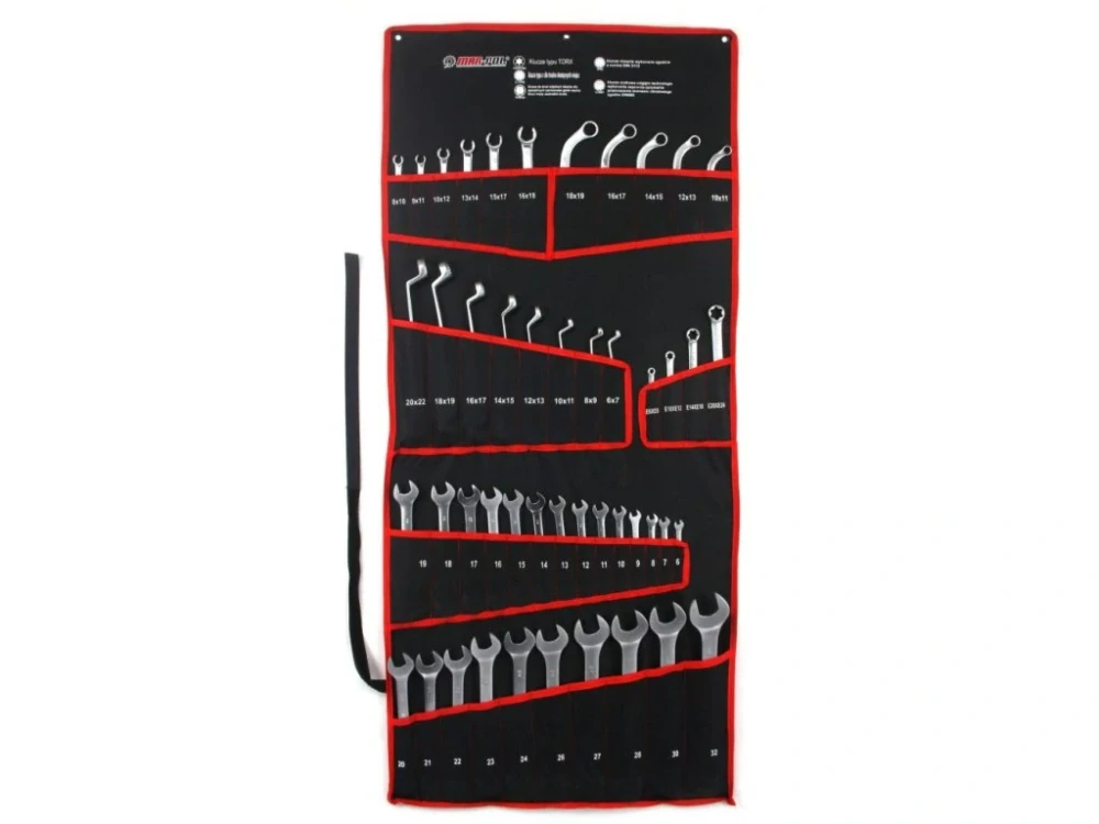 Velká sada klíčů uložená v skládacím obalu s očky pro zavěšení, v sadě jsou klíče očko-otevřené, zahnuté, S klíče, TORX, na brzdové trubky, 47 ks, vyrobeno z Cr-V oceli.