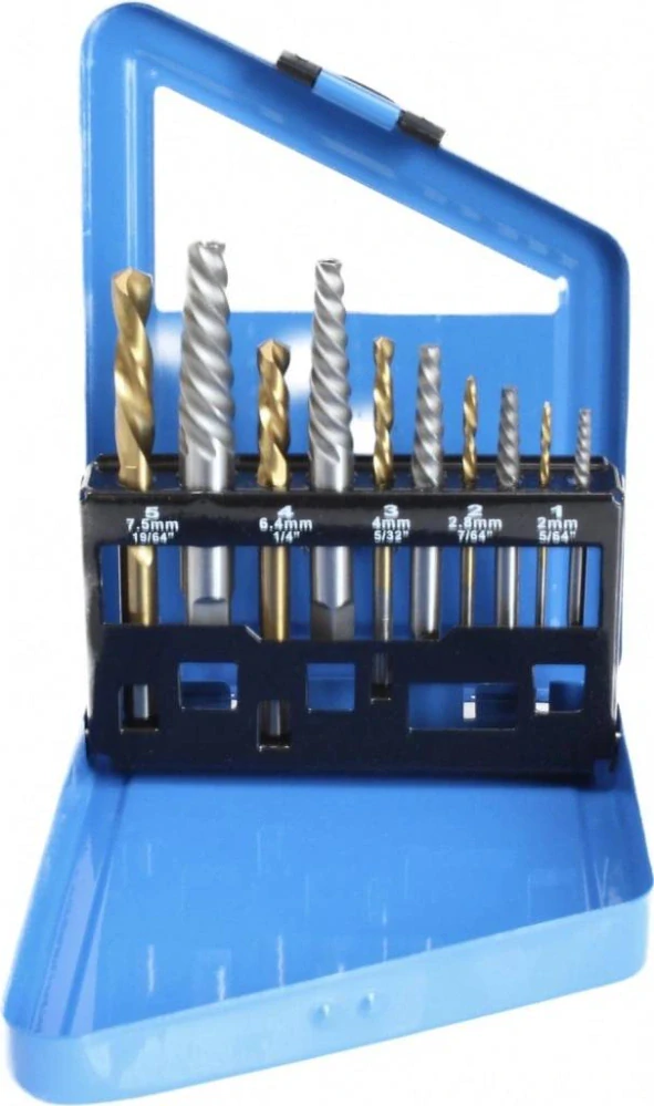 Sada levostranných vrtáků a vytahováků pro odstraňování zlomených šroubů, svorníků, opracovaných šroubů nebo pravostranných potrubních tvarovek.