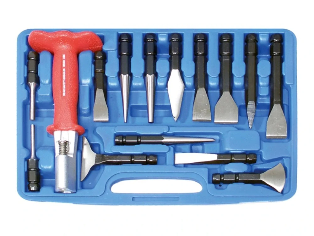 Obsahuje: 1 rukojeť pro sekáče, 7x plochý sekáč,1x křížový sekáč, 1 důlčík, 3x vyrážeč, 2x děrovač.
