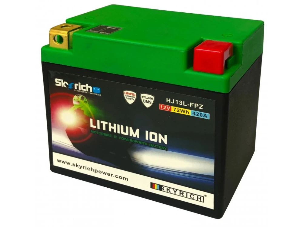 Lithiové akumulátory Skyrich LiFePO4 jsou známé svými malými rozměry. Dodávají se s distančními podložkami pro uzpůsobení jakémukoli bateriovému prostoru v motocyklu. Při správném používání nehrozí riziko výbuchu nebo požáru, jako je tomu u jiných lithiových akumulátorů. Akumulátor HJ13L-FPZ je šetrný k životnímu prostředí, protože neobsahuje jedovaté kovy jako olovo, rtuť či kobalt. Neobsahuje ani kyselinu sírovou, jako je tomu u olověných akumulátorů, a proto je použitelný v jakékoli poloze, včetně "vzhůru nohama". Akumulátor se dodává naplněný, přednabitý, připravený k okamžitému provozu.