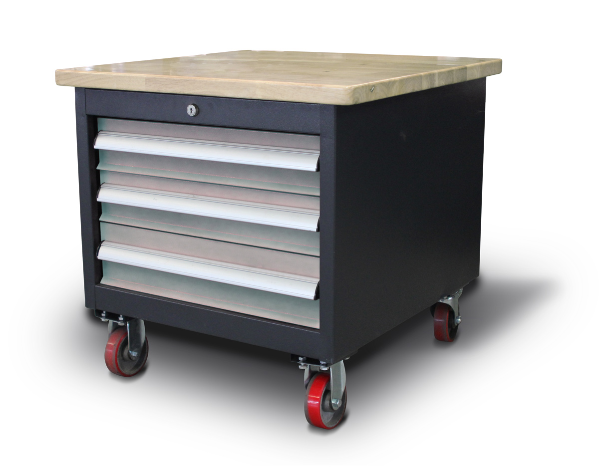 Univerzální pojízdný podstavec / montážní stůl se třemi uzamykatelnými zásuvkami.