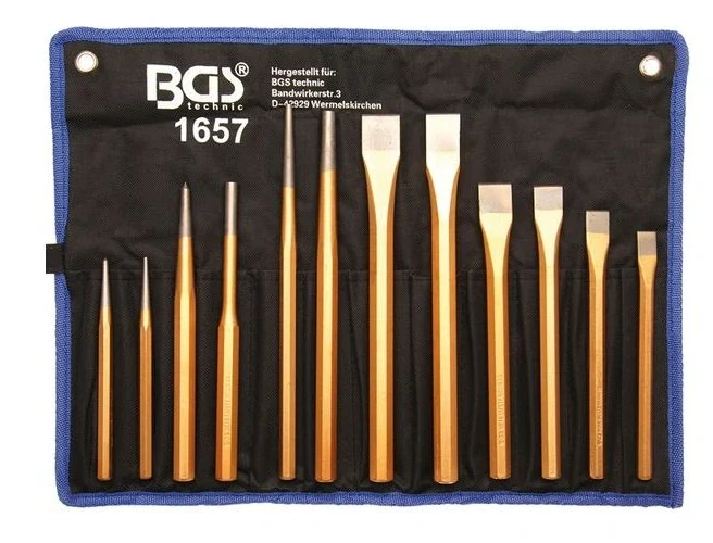 Nástroje na vyrážení, sekání a vytváření otvorů, zesílené, sada 12 dílů v látkovém obalu s očky pro zavěšení na stěnu – BGS technic 1657