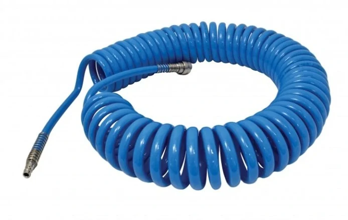 Spirálová hadice je vyrobena z pružného polyuretanu, odolná proti oděru a roztržení, vybavená koncovkami připravenými pro připojení ke kompresoru a pneumatickému nářadí.