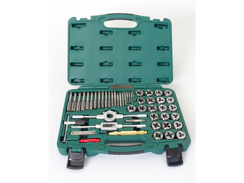 - 44x závitníky a závitová očka: M3x0.5 – M3x0.6 – M4x0.7 – M4x0.75 – M5x0.8 – M5x09 – M6x0.75 – M6x1.0 – M7x0.75 – M7x1.0 – M8x1.0 – M8x1.25 – M9x1.0 – M9x1.25 – M10x1.0 – M10x1.25 – M10x1.5 – M11x1.5 – M12x1.5 – M12x1.25 – M12x1.75 – 1/8NPT27